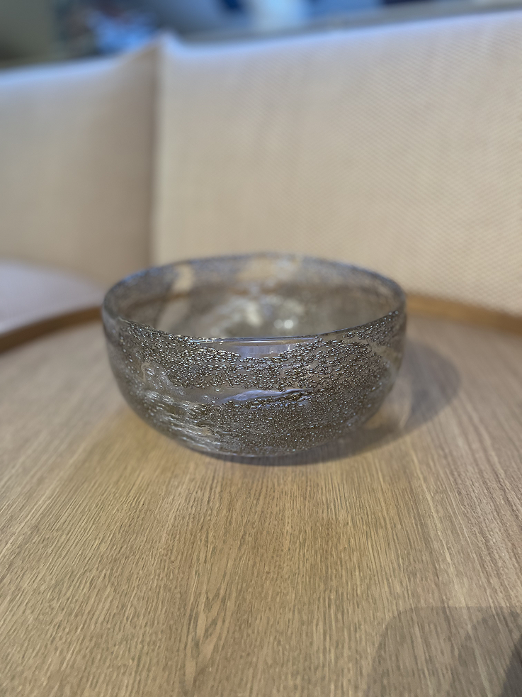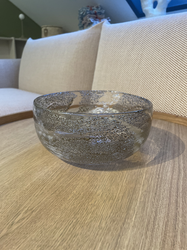 En håndblåst vintage glassbolle fra 1970-tallet, designet av Benny Motzfeldt. Bollen har gråfarget glass med dekorative luftbobler, og utstråler skandinavisk eleganse og tidløs formgiving.