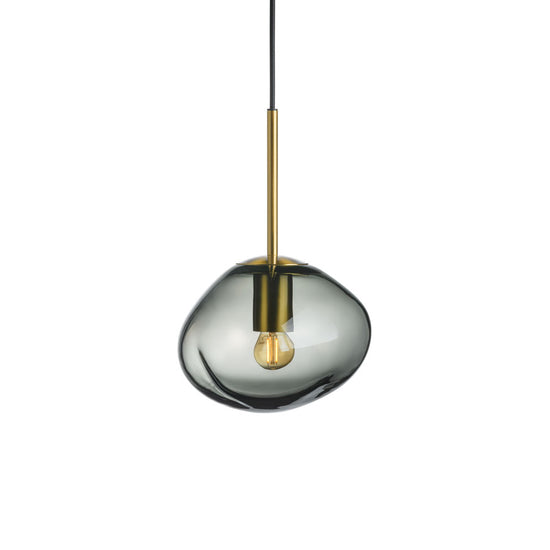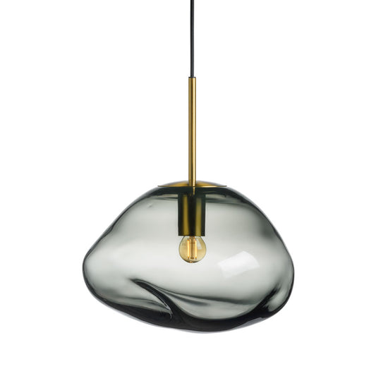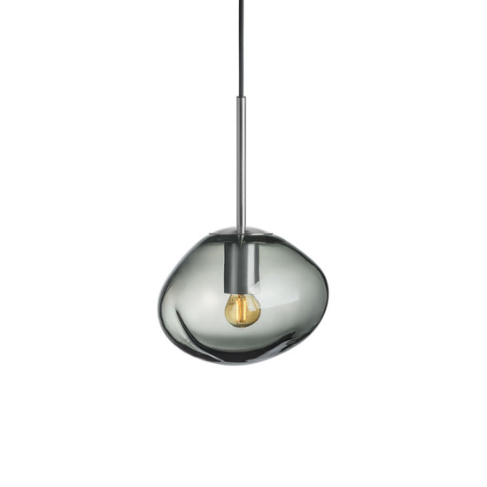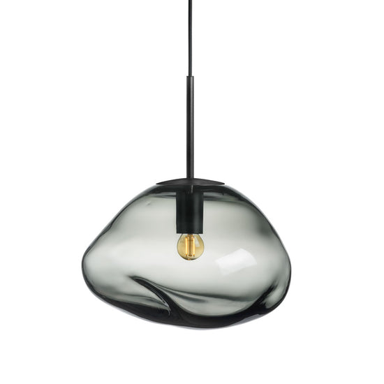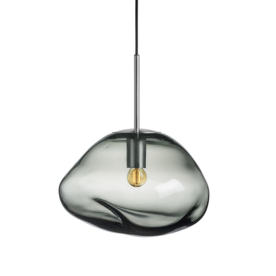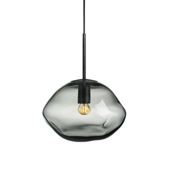 Crystal Stone i fargen røk grå er en pendellampe i munnblåst glass med et mykt, organisk uttrykk. Den passer godt over spisebord, i stue eller i en gang der du ønsker et tydelig, men rolig blikkfang. Glasset får liv når lyset tennes, og den ujevne, naturlige formen gjør at hver lampe kan variere litt.