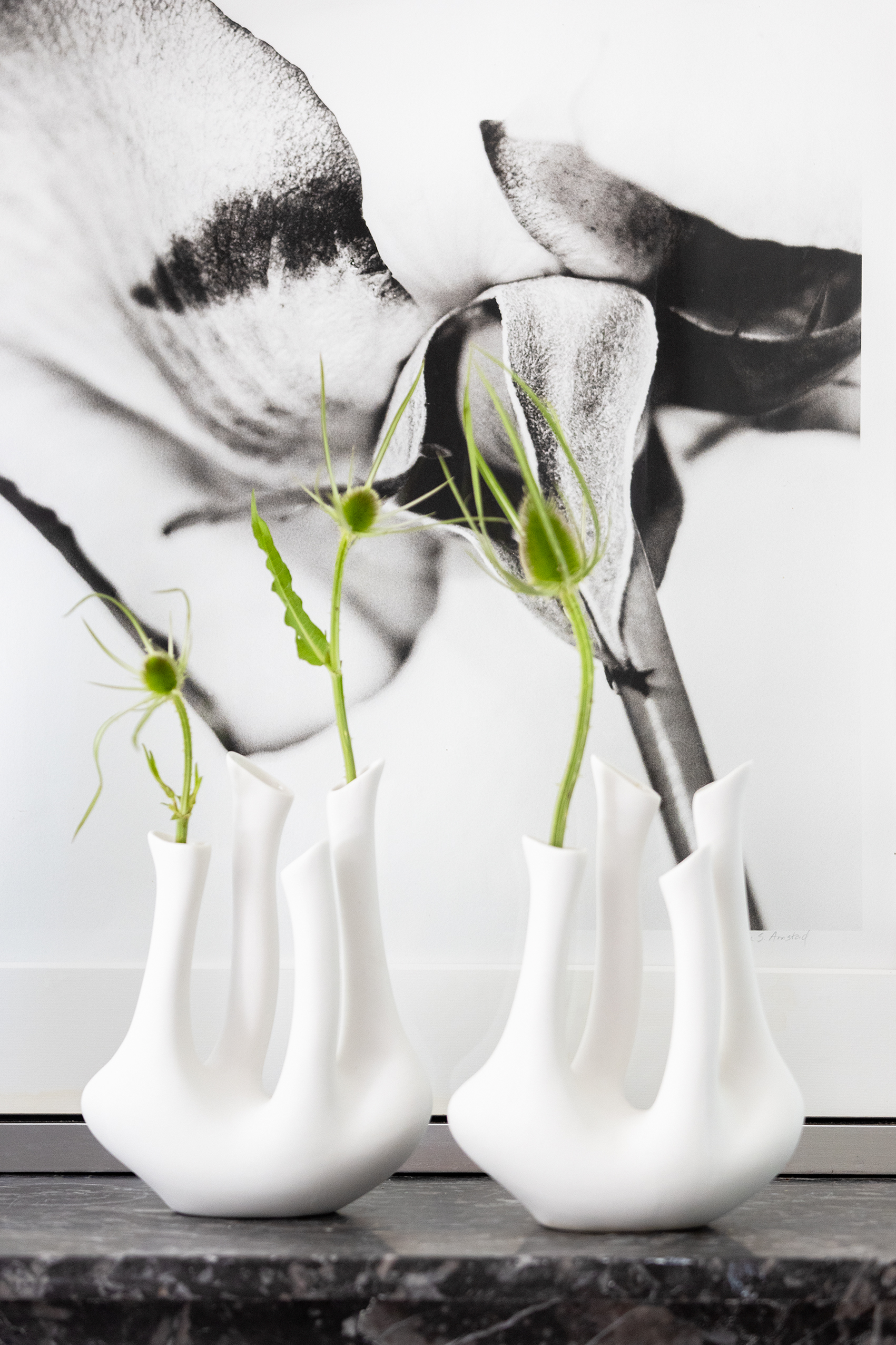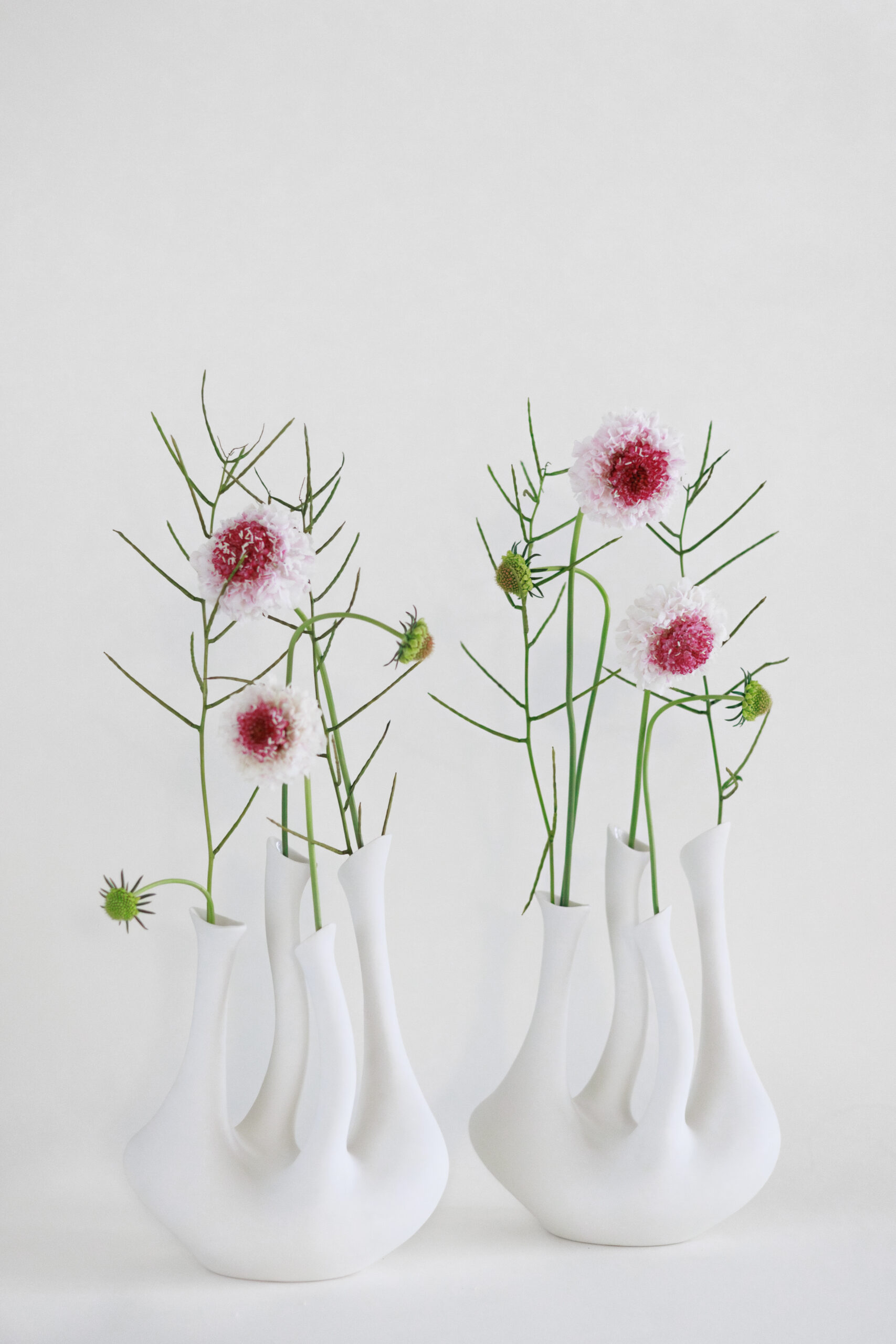 Dancer er en elegant porselensvase med en flytende, dansende silhuett. Den matte overflaten fremhever de myke kantene og gir et rolig, sofistikert uttrykk. Størrelsen passer som blikkfang på spisebord, hylle eller skjenk, og formen løfter enkle buketter eller noen få grener. Hver vase er nøye håndkuttet for å gi skarpe, presise linjer. Innsiden er glasert for praktisk bruk og enkel rengjøring. Dancer kombinerer skandinavisk enkelhet med et kunstnerisk preg, og passer i både moderne og klassiske miljøer.