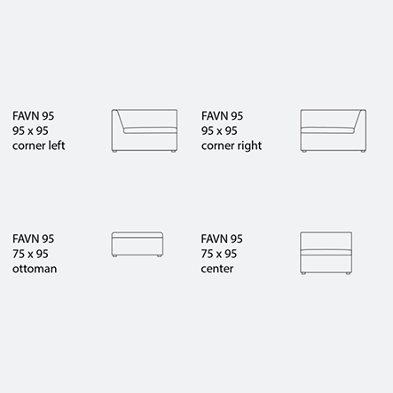 - Moduler: hjørne 95 x 95 cm, senter 75 x 95 cm, ottoman 75 x 95 cm