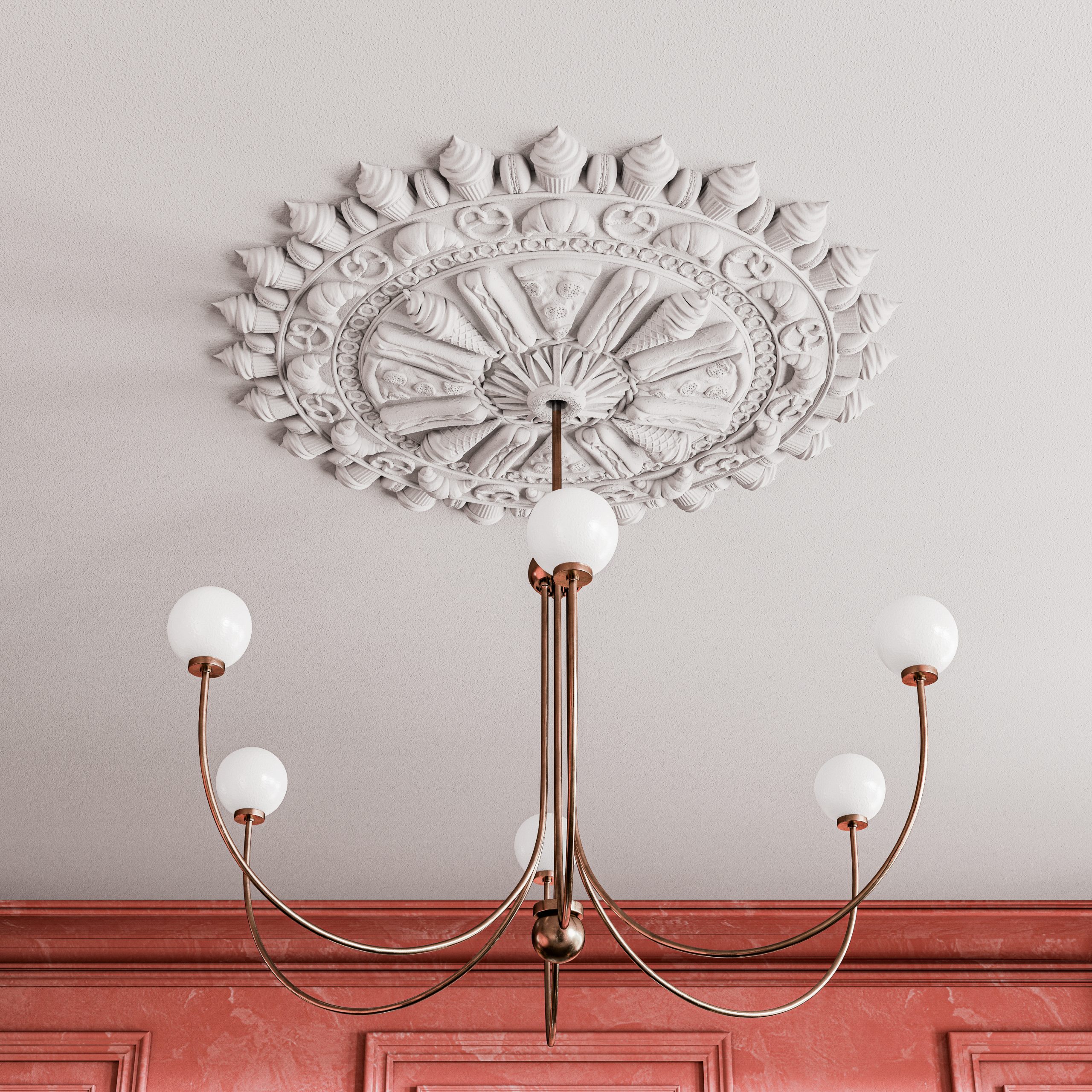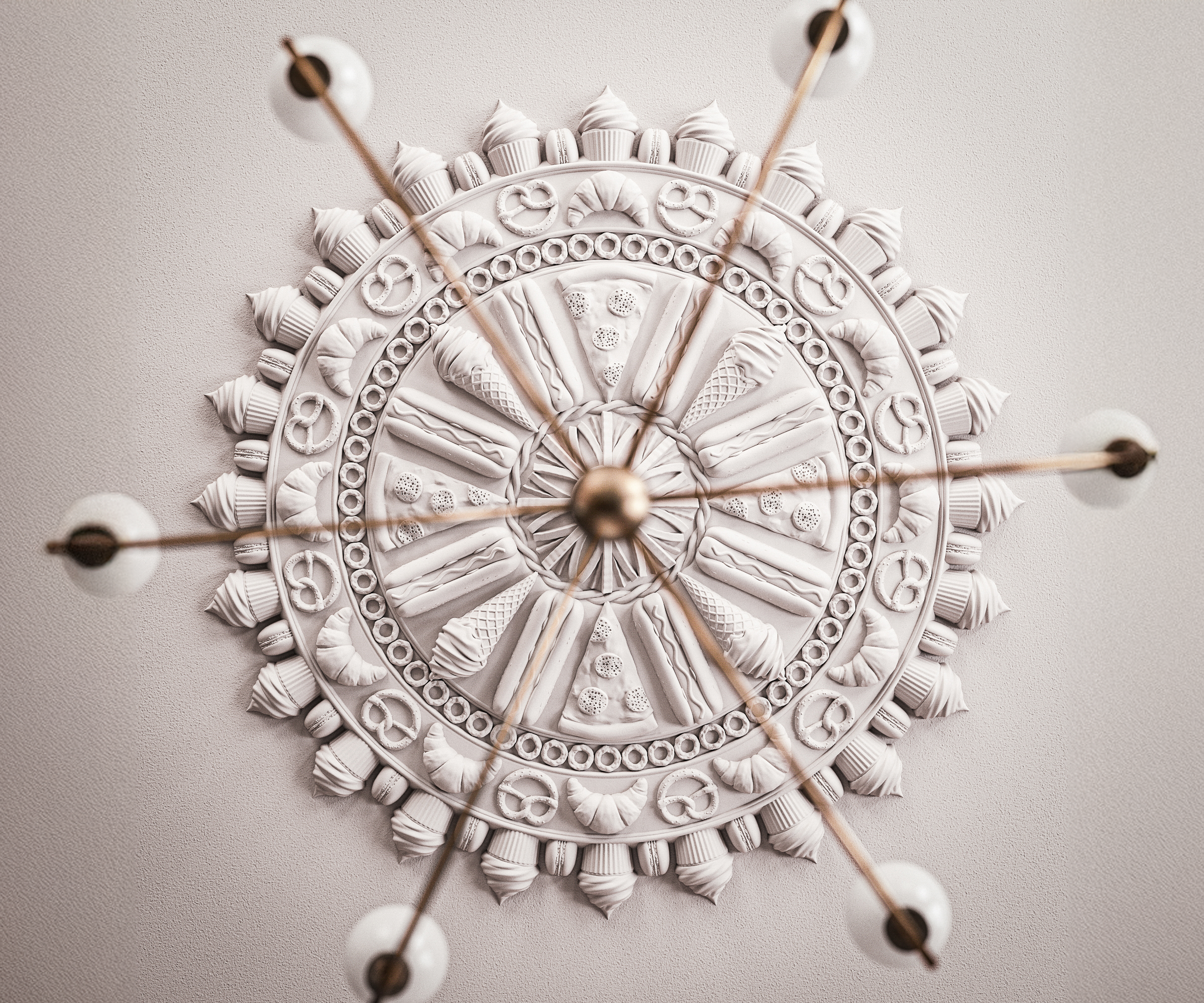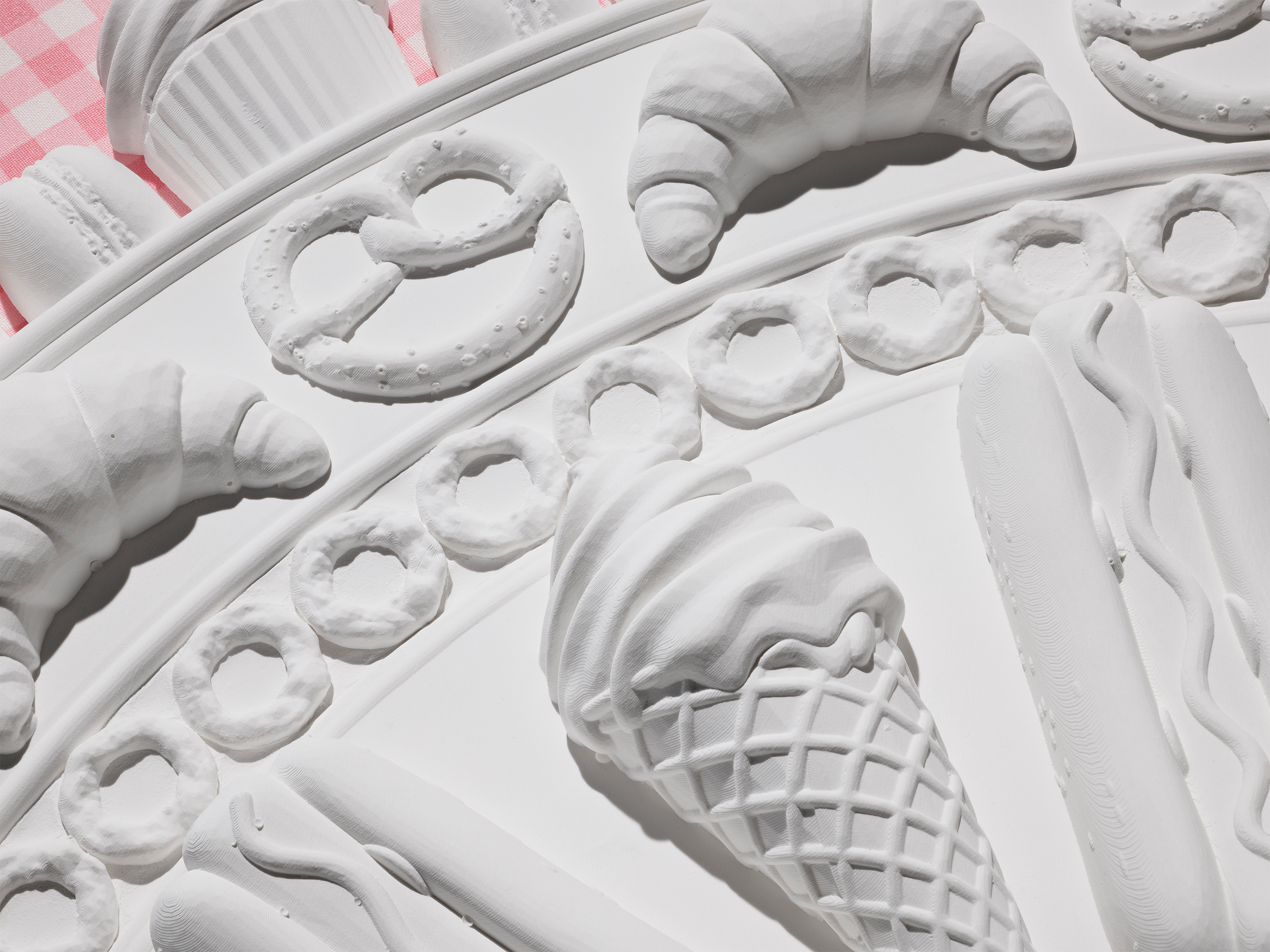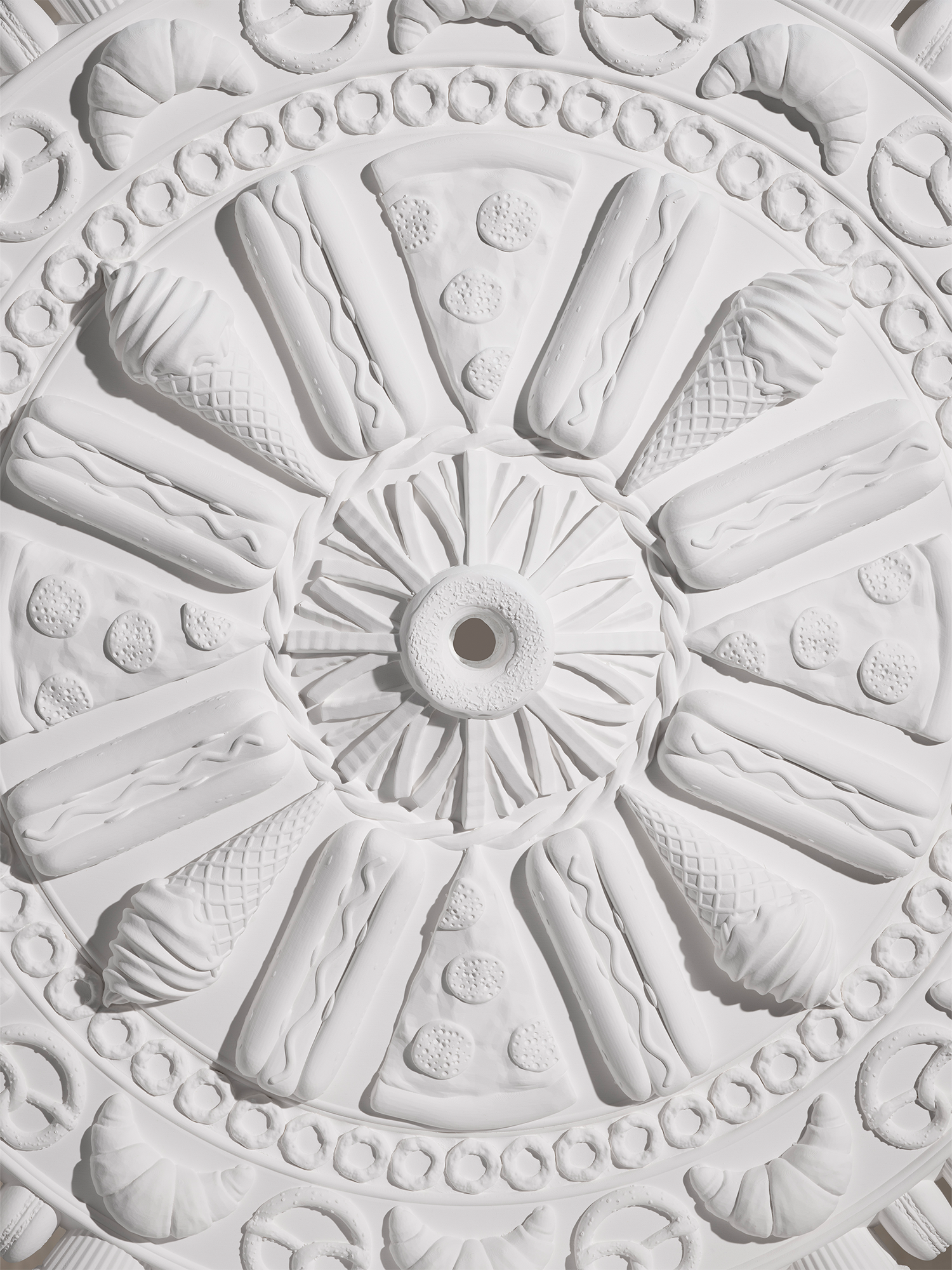 Glutine takrosette fra Rebel Rosette kolleksjonen er et skulpturelt objekt støpt i hvit gips. Der tradisjonelle takrosetter historisk har avbildet ornamentale planter og religiøse symboler, viser denne donuts, pølser og pommes frites. Takrosetten er håndlaget med samme stil som klassiske motiver for å etterligne sine antikke forgjengere, men med detaljer som gjør at resultatet blir noe uventet og forfriskende – et blikkfang som får folk til å se to ganger.