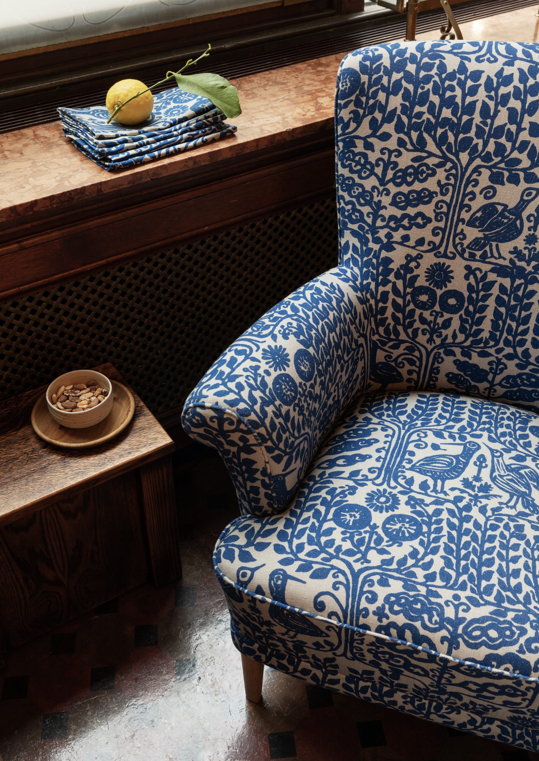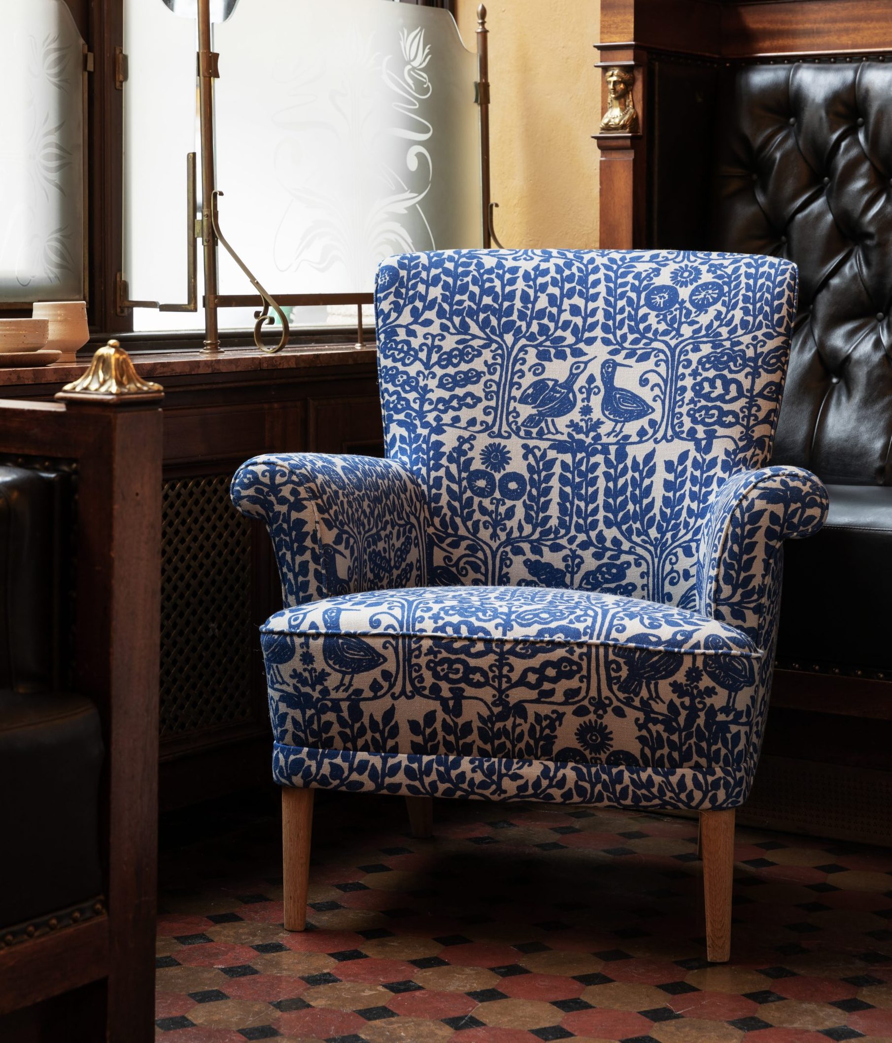 Puffen Møbeltapetserverksted har trukket om lenestolen Katinka, designet av Alf Sture i 1952-53. Stolen er trukket i Fuglemotiv, et lin- og viskosetekstil basert på Alf Stures originale tegninger. Mønsteret har tidligere vært trykket på en duk og er nå reprodusert som møbelstoff av hans arvtagere hos Sture Design.