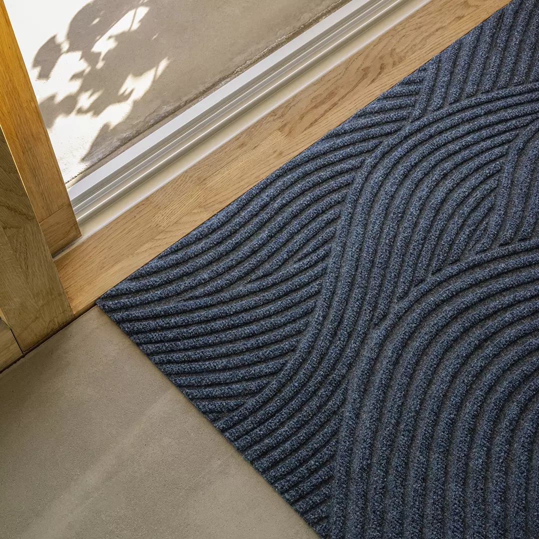 “Sea” is inspired by water, as evidenced by the wavy motif and the calm, deep blue color. The three-dimensional pattern is sensual and meditative, and creates calm and presence as you pass the doorstep. The mat is part of the Heymat + collection, which also consists of Stone, Grass and Sand.