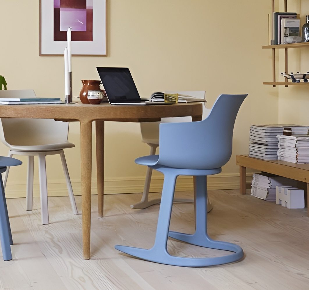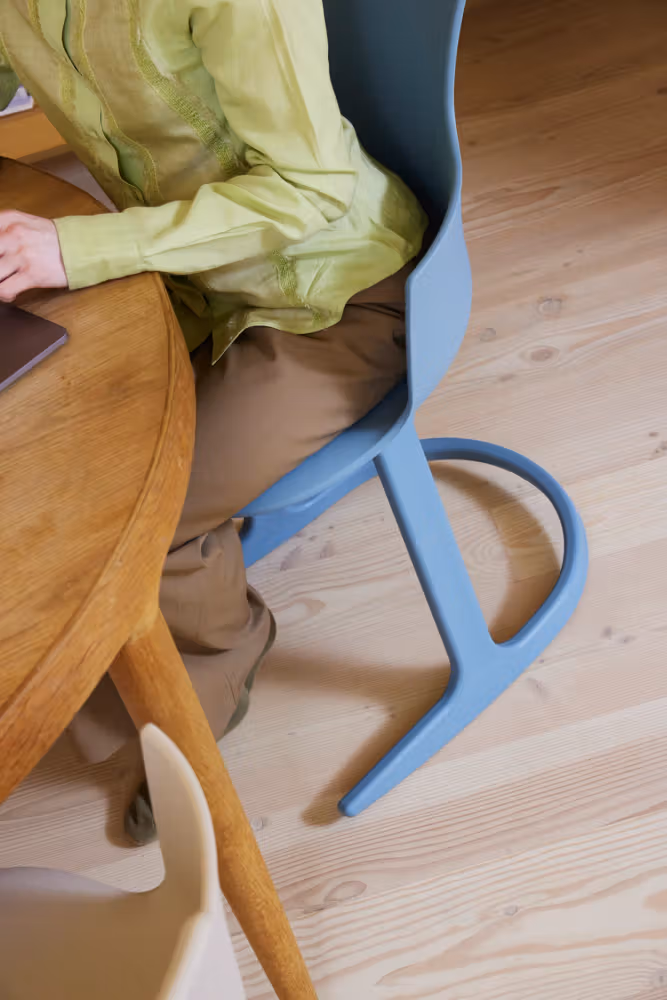 Social Tilt er en moderne spise-/møtestol som inviterer til aktiv sitting i hverdagen. Skallet er støpt for lav vekt og høy slitestyrke, og stolen er designet for enkel resirkulering med færre materialer. Sitteopplevelsen er balansert – du kan bevege deg lett uten å miste støtte.