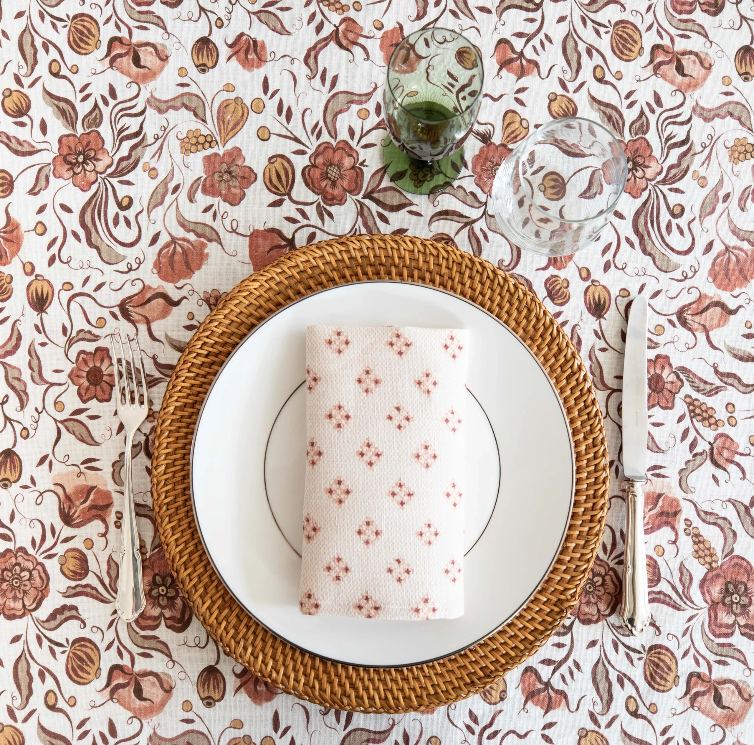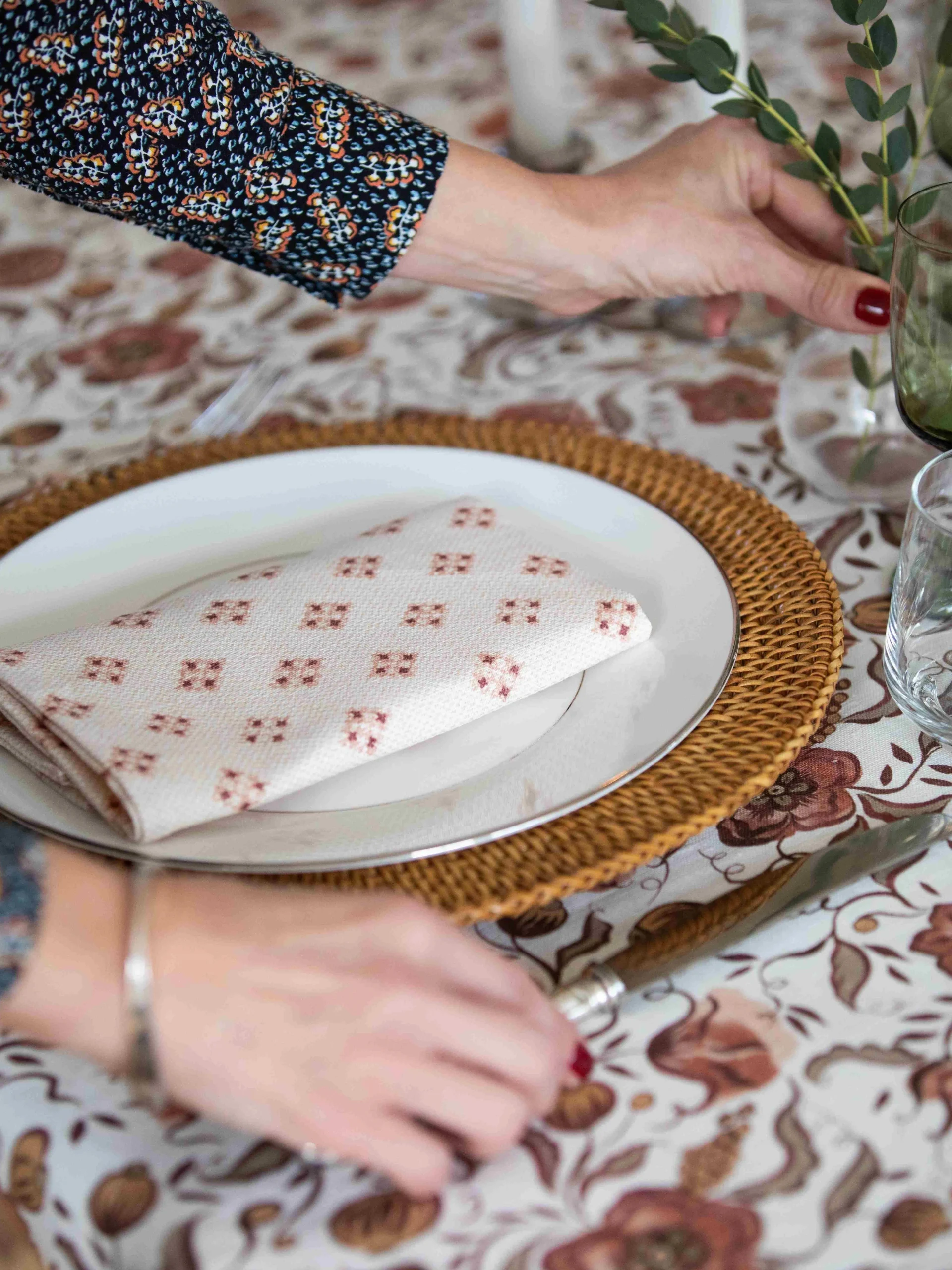 Ullin Rose servietter er en begrenset utgave i lin med mønster inspirert av korssting fra Ullensaker-bunad. Tekstilen er trykket med miljøvennlig blekk og har en robust kvalitet som tåler daglig bruk.