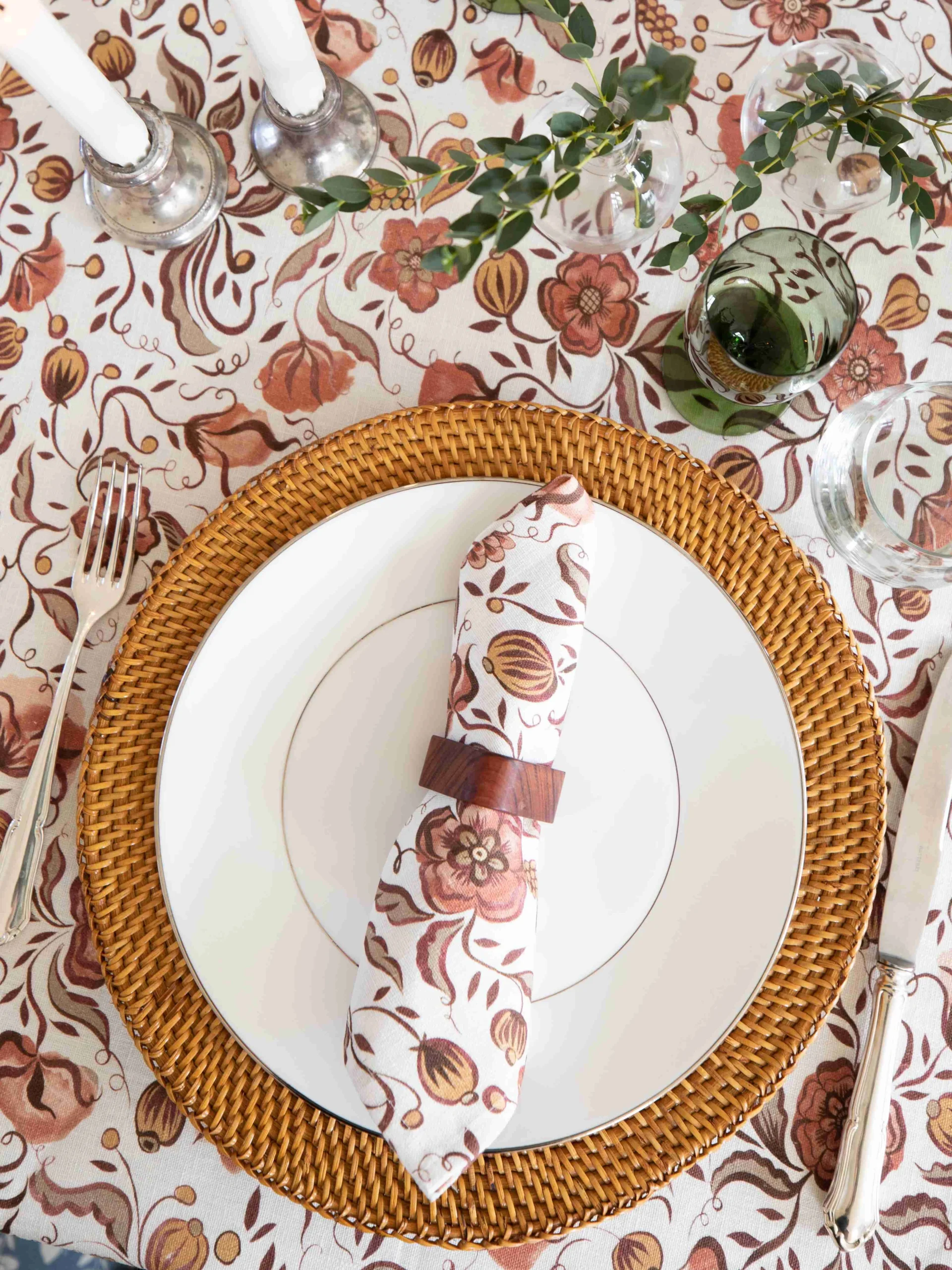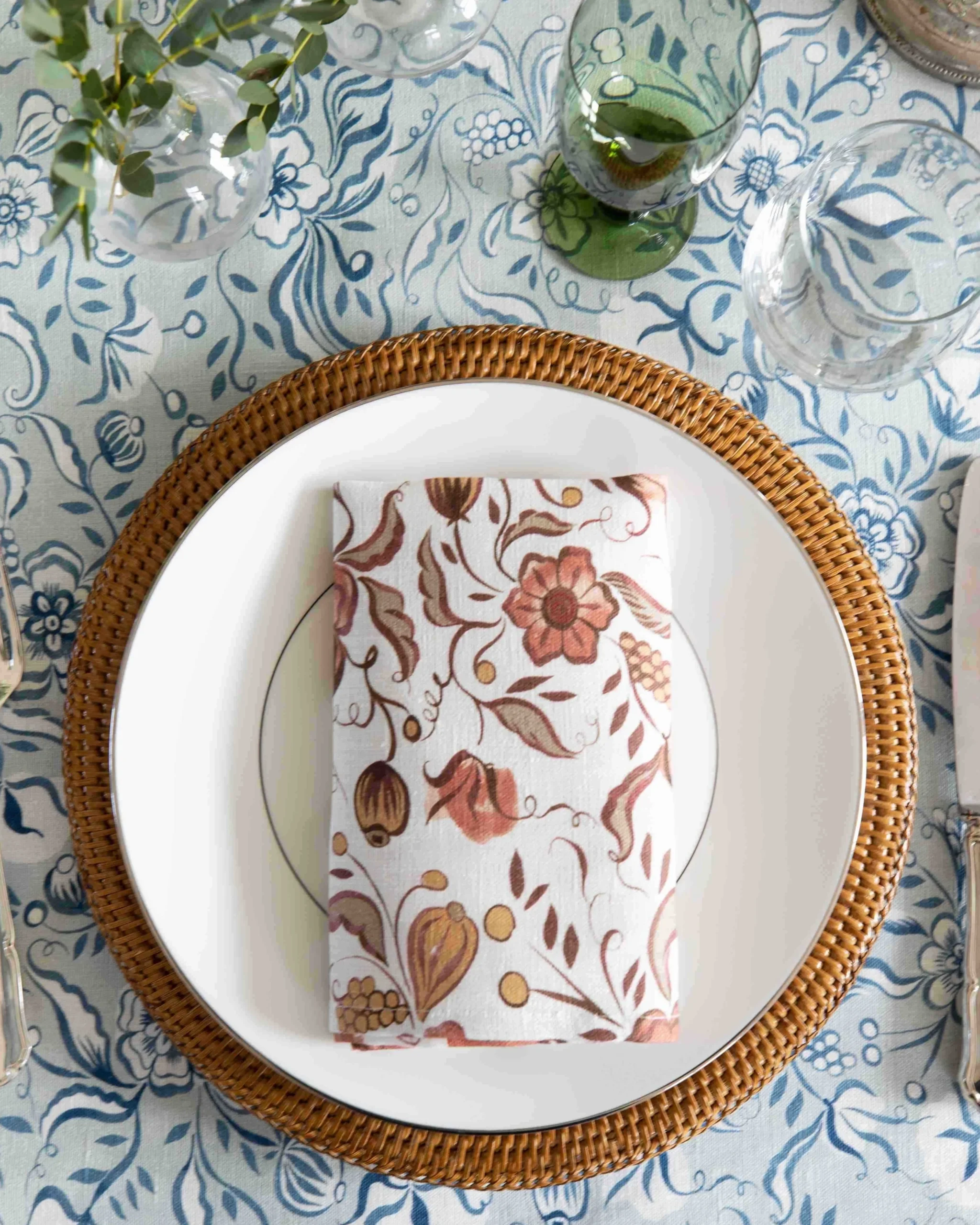 Uvdal Autumn servietter er en begrenset utgave i lin med mønster inspirert av rosemaling fra Uvdal stavkirke. Tekstilen er trykket med miljøvennlig blekk og har en robust kvalitet som tåler daglig bruk. Designet gir borddekkingen et tydelig skandinavisk uttrykk uten å virke prangende.