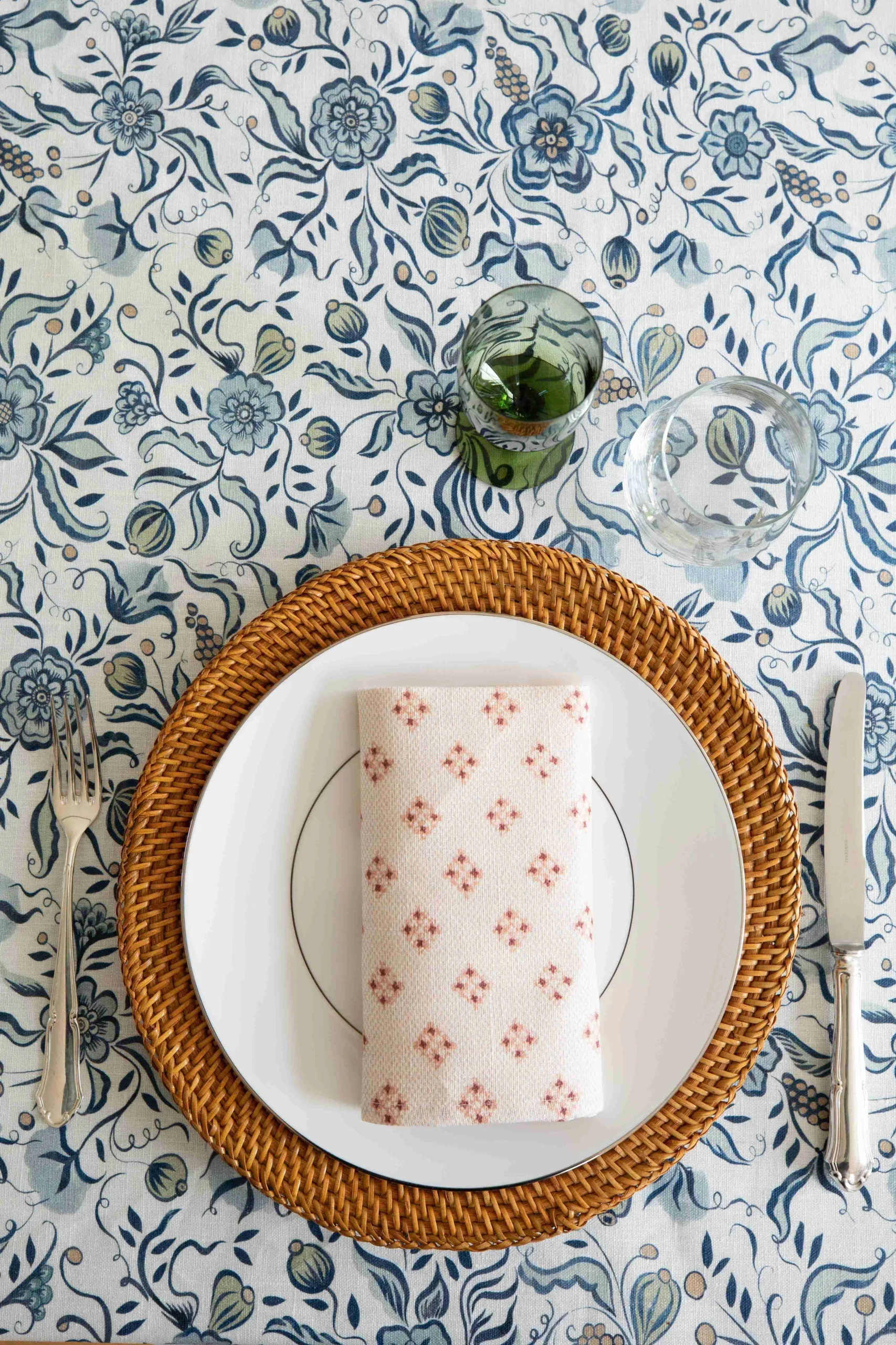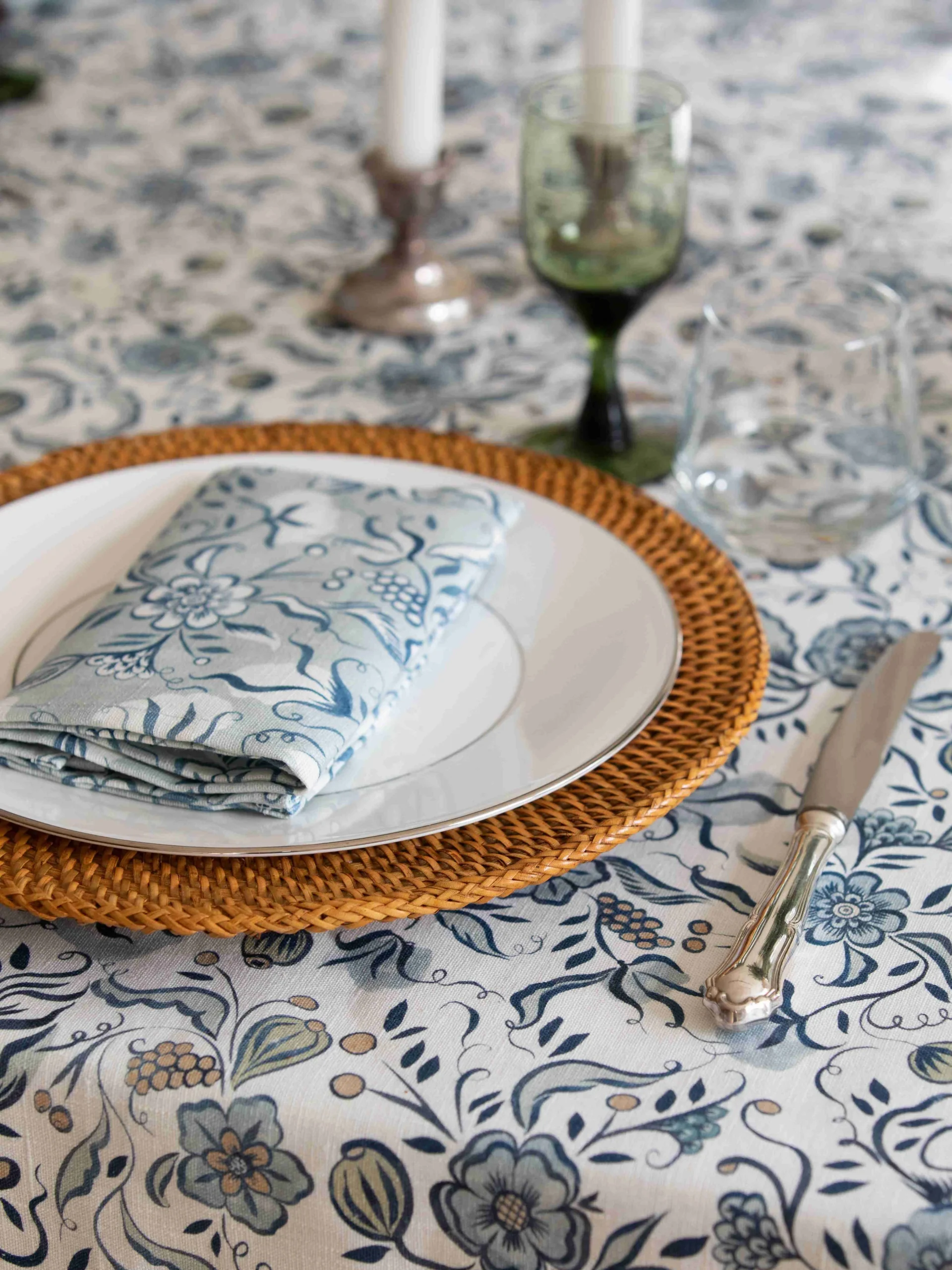 Uvdal Summer duk er en begrenset utgave i lin med mønster inspirert av rosemaling fra Uvdal stavkirke. Tekstilen er trykket med miljøvennlig blekk og har en robust kvalitet som tåler daglig bruk.
