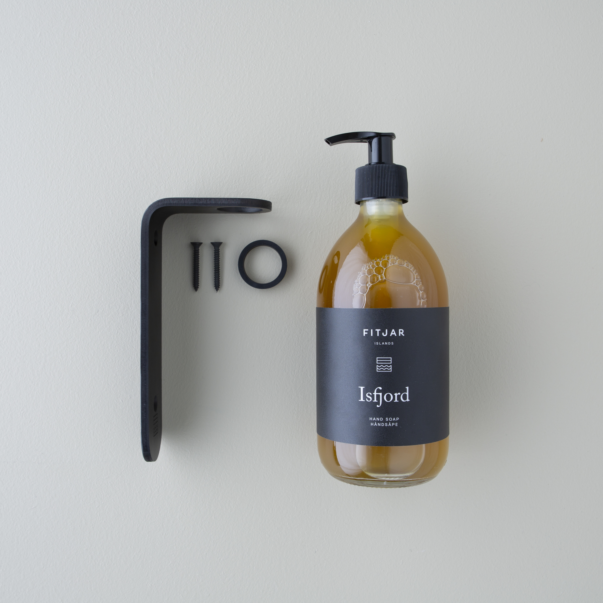 Veggbrakett Type I er en enkel og praktisk holder som fester Fitjar Islands 250 ml og 500 ml flasker sikkert på veggen. Den åpne utformingen gjør rengjøring enkelt, og gummiringen holder flasken stabilt uten klirring. Braketten monteres ved å feste ringen på flaskehalsen og skru pumpen på igjen etter at flasken er satt inn. Produsert i Norge i anodisert aluminium med matt svart finish, og passer godt i hjemmemiljøer.