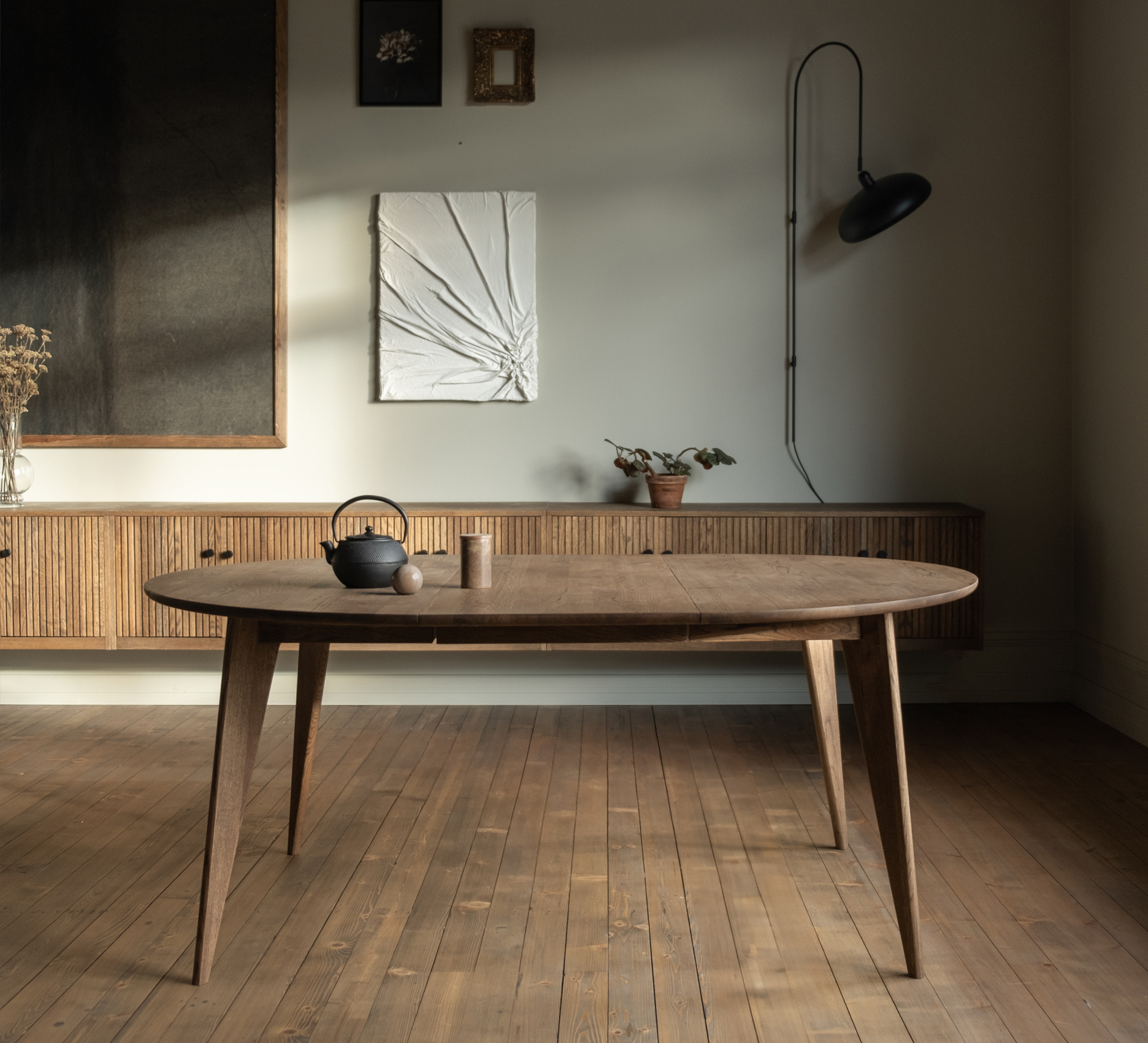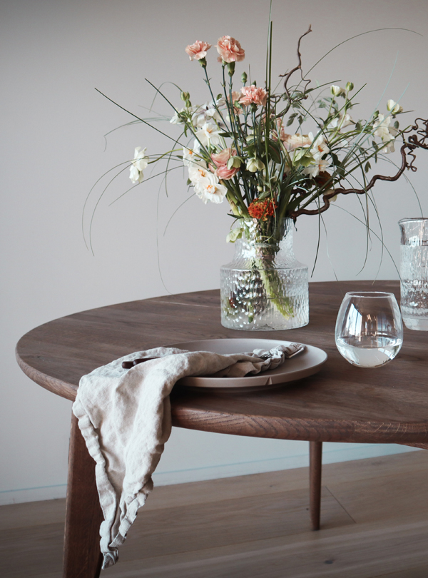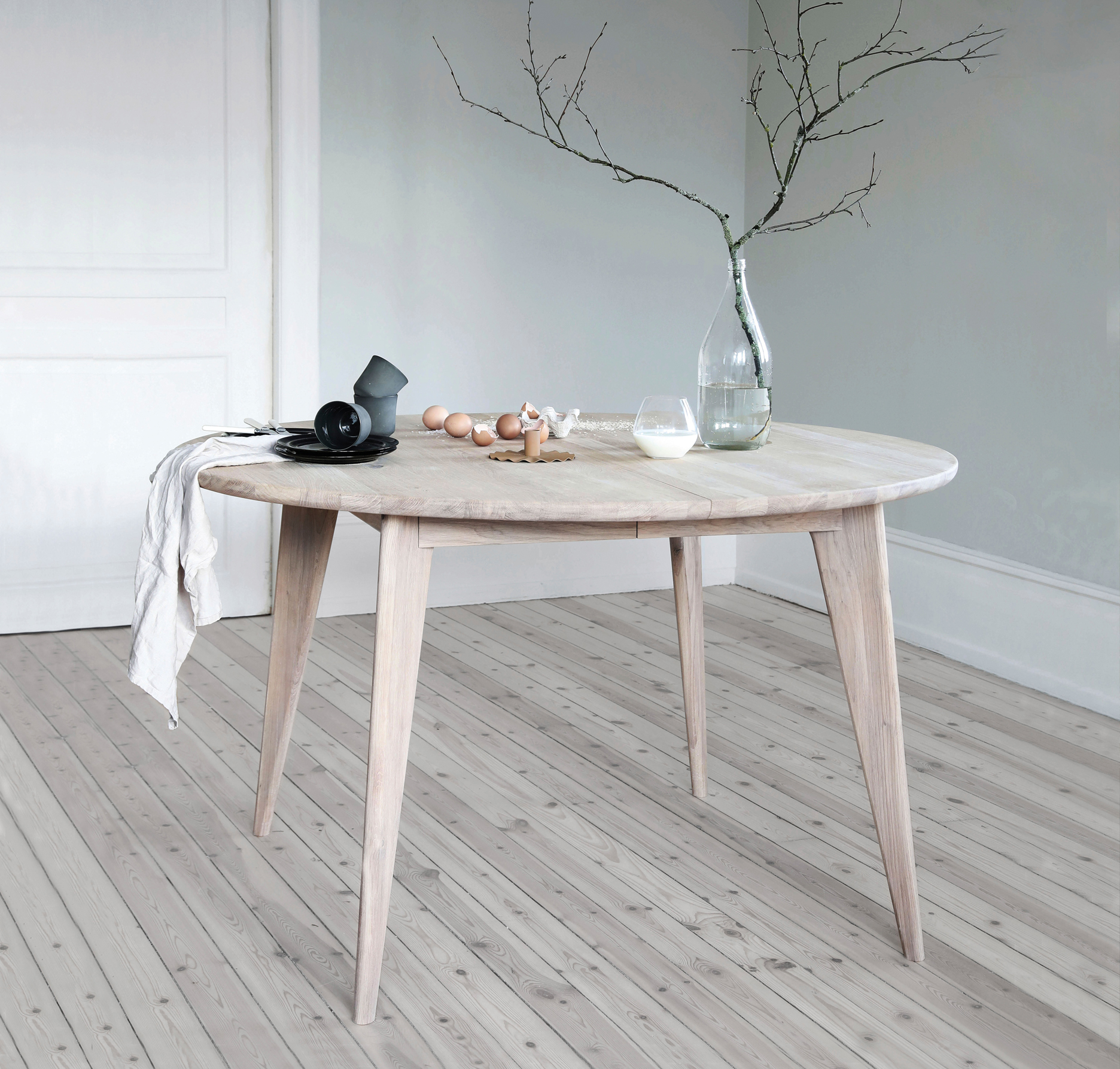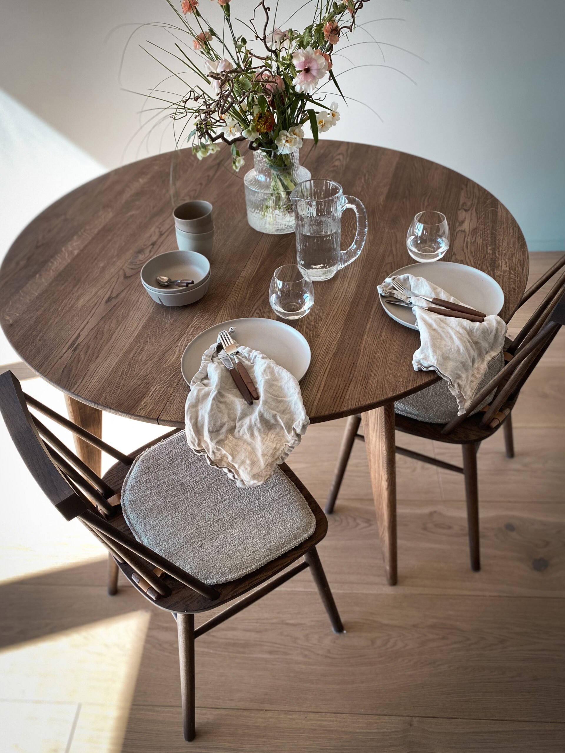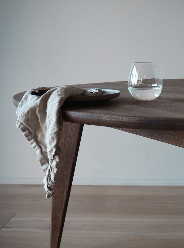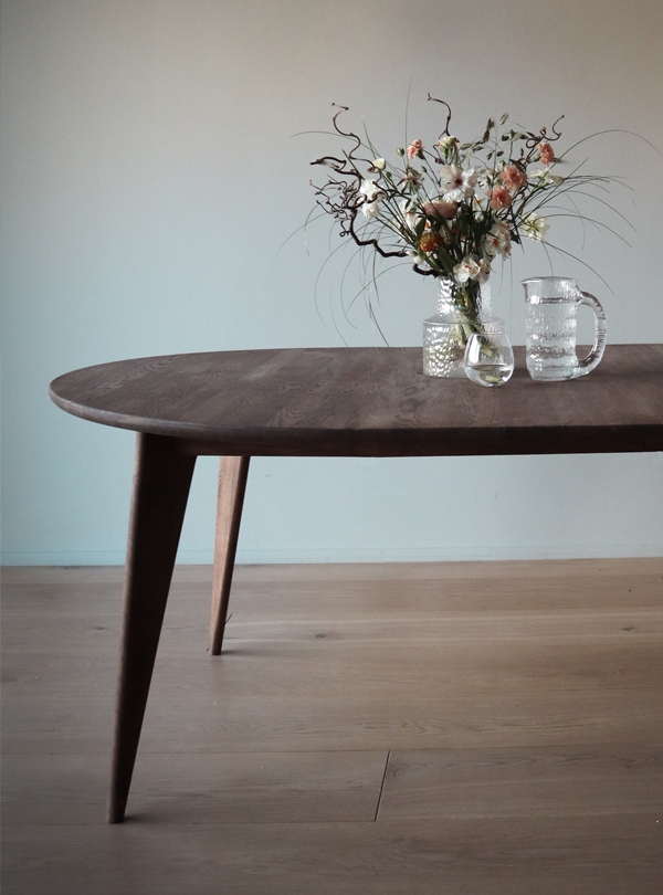 Viken rundt spisebord fra Ygg & Lyng er et rundt spisebord i heltre vill eik som passer godt til sosiale måltider. Den runde bordplaten gjør at alle rundt bordet ser hverandre, og skråstilte ben gir et lett og moderne uttrykk. Bordet kan kombineres med ulike stoler og spisesofaer for å skape en personlig spisesone. Overflaten leveres i flere oljebehandlinger som gir ulik karakter til treverket. Viken rundt leveres umontert og monteres ved å feste bena til bordplaten.