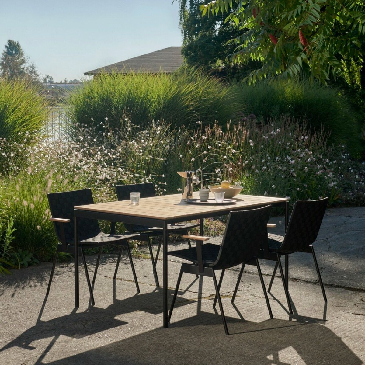 Ville AV25 er det mindre av de to spisebordene i serien og passer godt på terrasser der du vil ha god plass uten at bordet tar over hele uteområdet. Bordplaten i teak gir et varmt uttrykk og en overflate som eldes pent, enten du lar den få patina eller oljer den jevnlig.